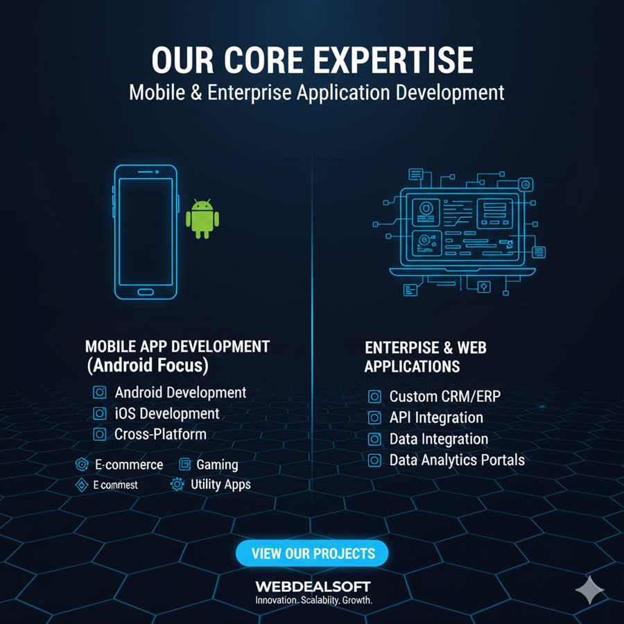 Android Development (Our Core Strength): We specialize in building robust, feature-rich native Android applications using Java and the latest Android SDK, ensuring speed, compatibility, and a rich user experience on the fastest-growing global platform.